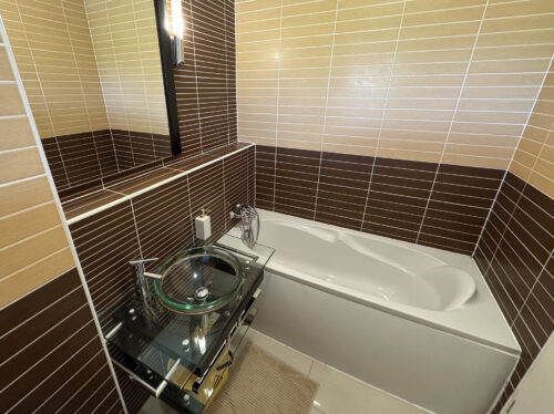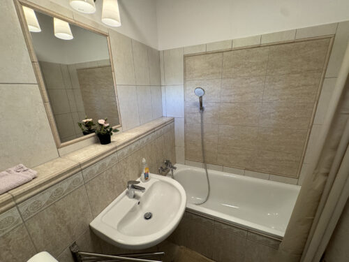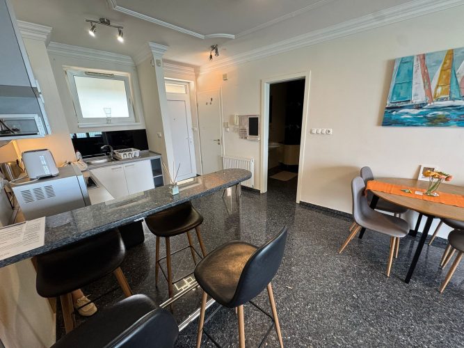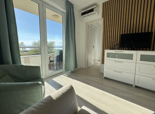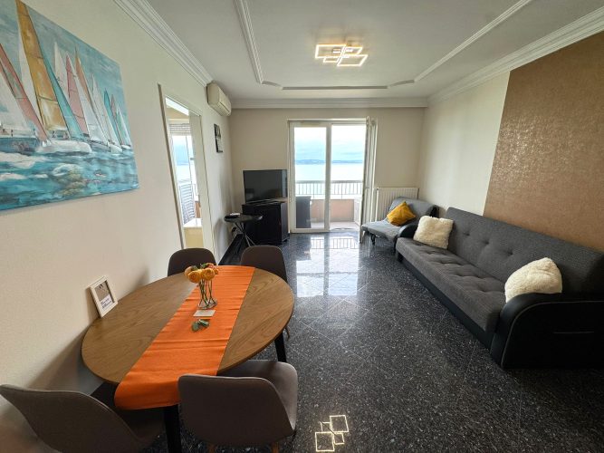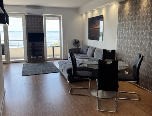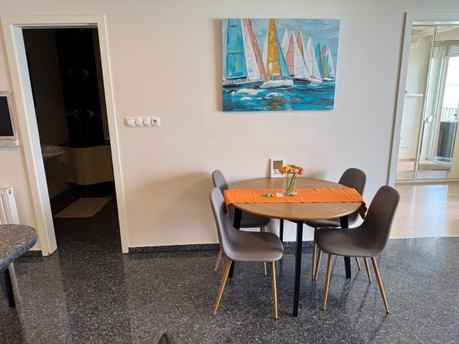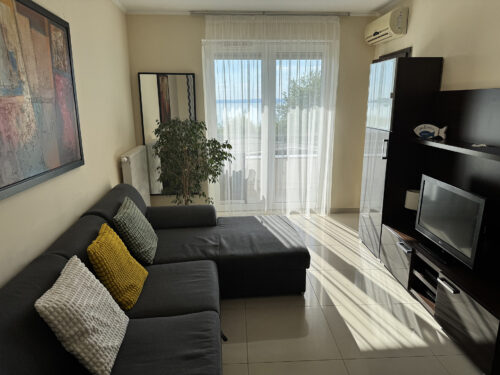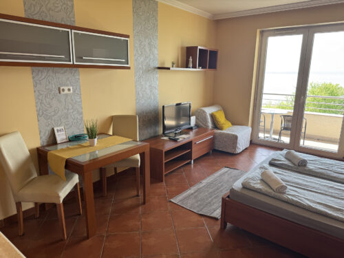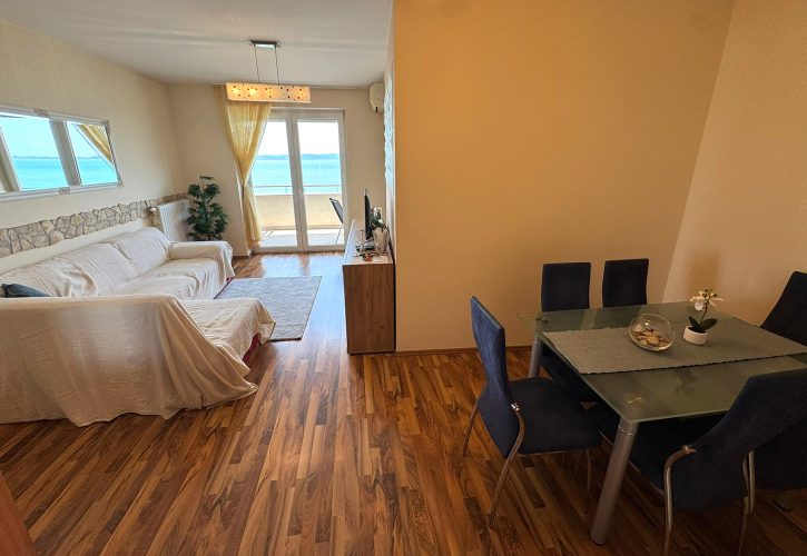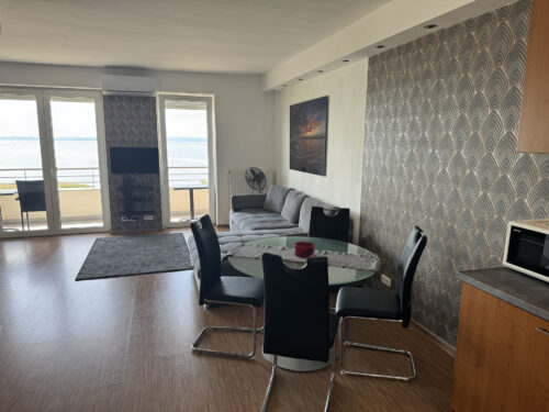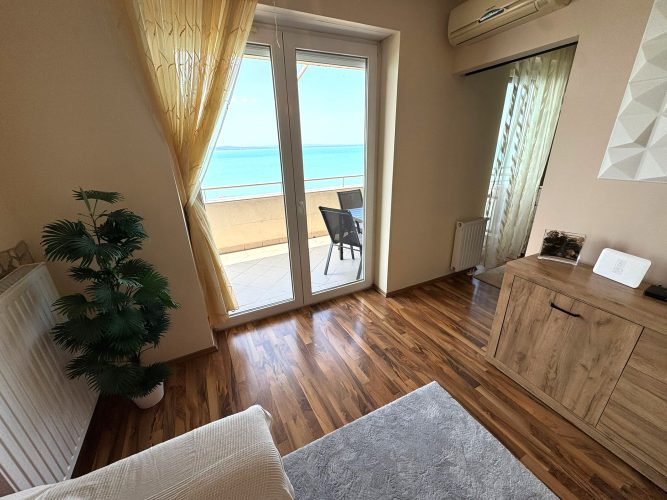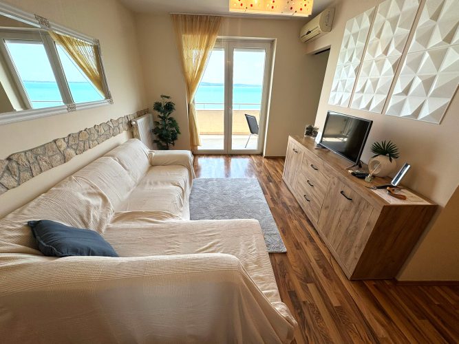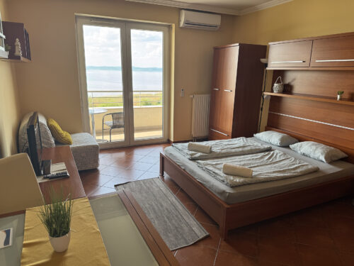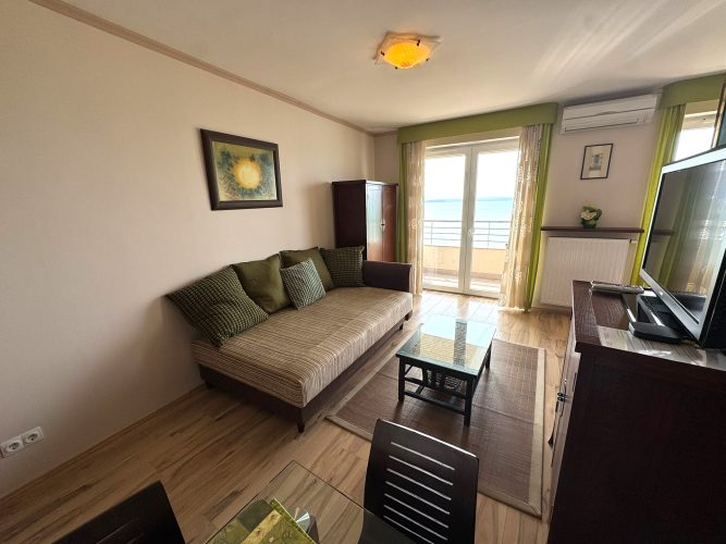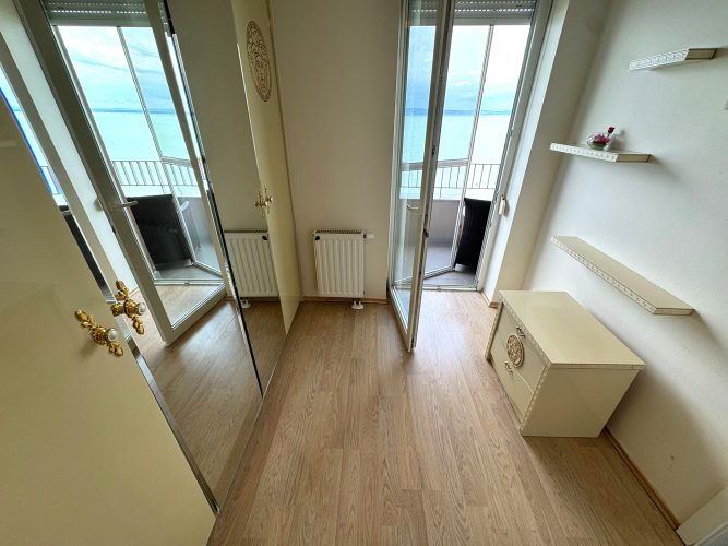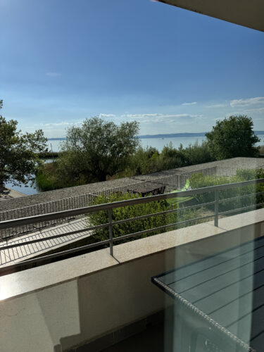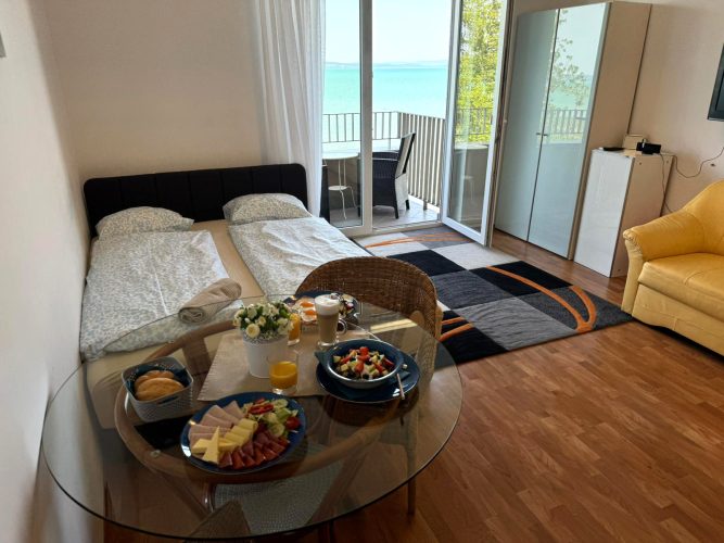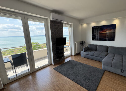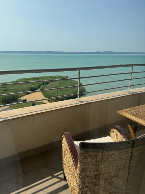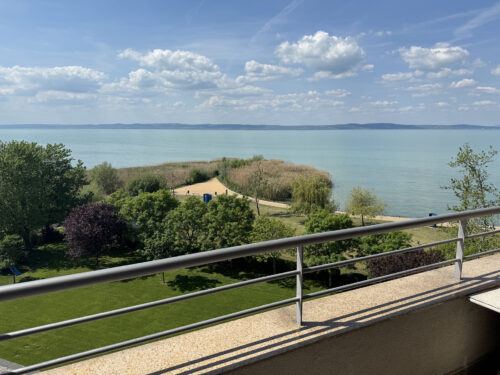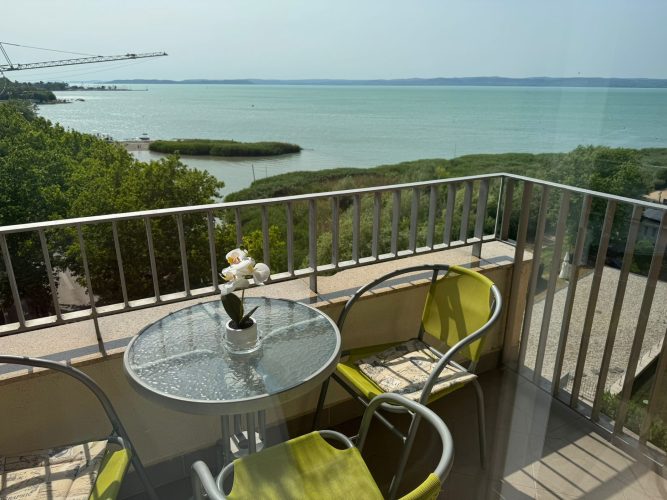 Nagy méretű erkély, kerti garnitúrával, balatoni panorámával